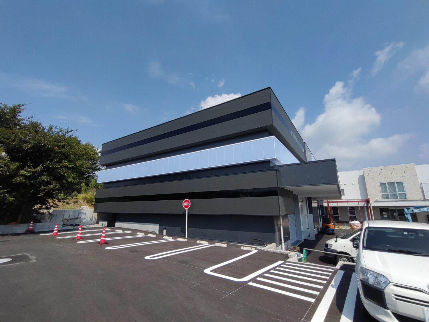 本社は白色でシンプルなデザインにしましたが、増築棟はダークトーンで外観形状にも変化のあるデザインとしました。